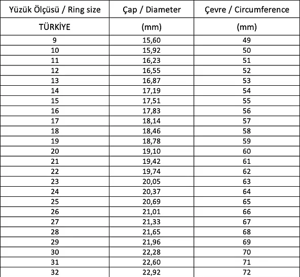 Yüzük ölçüsü için bir ip alın ve o ip ile parmak çapınızı ölçün. Sonrasında mezura veya cetvel yardımı ile ipten ölçü alın. Aşağıda yer alan tablo cm bazında parmağınızın yüzük ölçüsü karşılığını vermektedir.